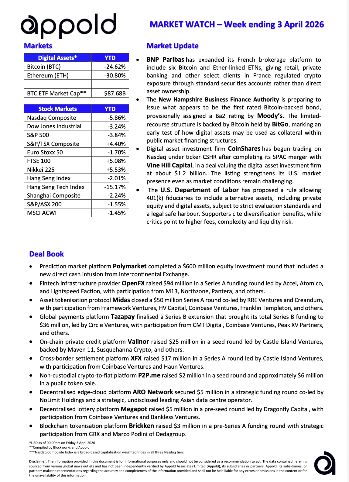 Appold View: Institutions such as BNP Paribas own key client relationships as they extend their product distribution. Longer term, however, the strongest position may sit with the custodians and infrastructure providers behind the market, as each additional bank integration strengthens their scale and credibility.